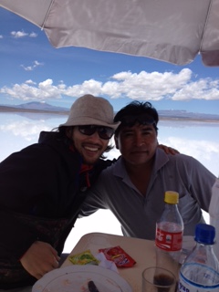 塩湖の上でランチ 横のすぎちゃんはボリビア人